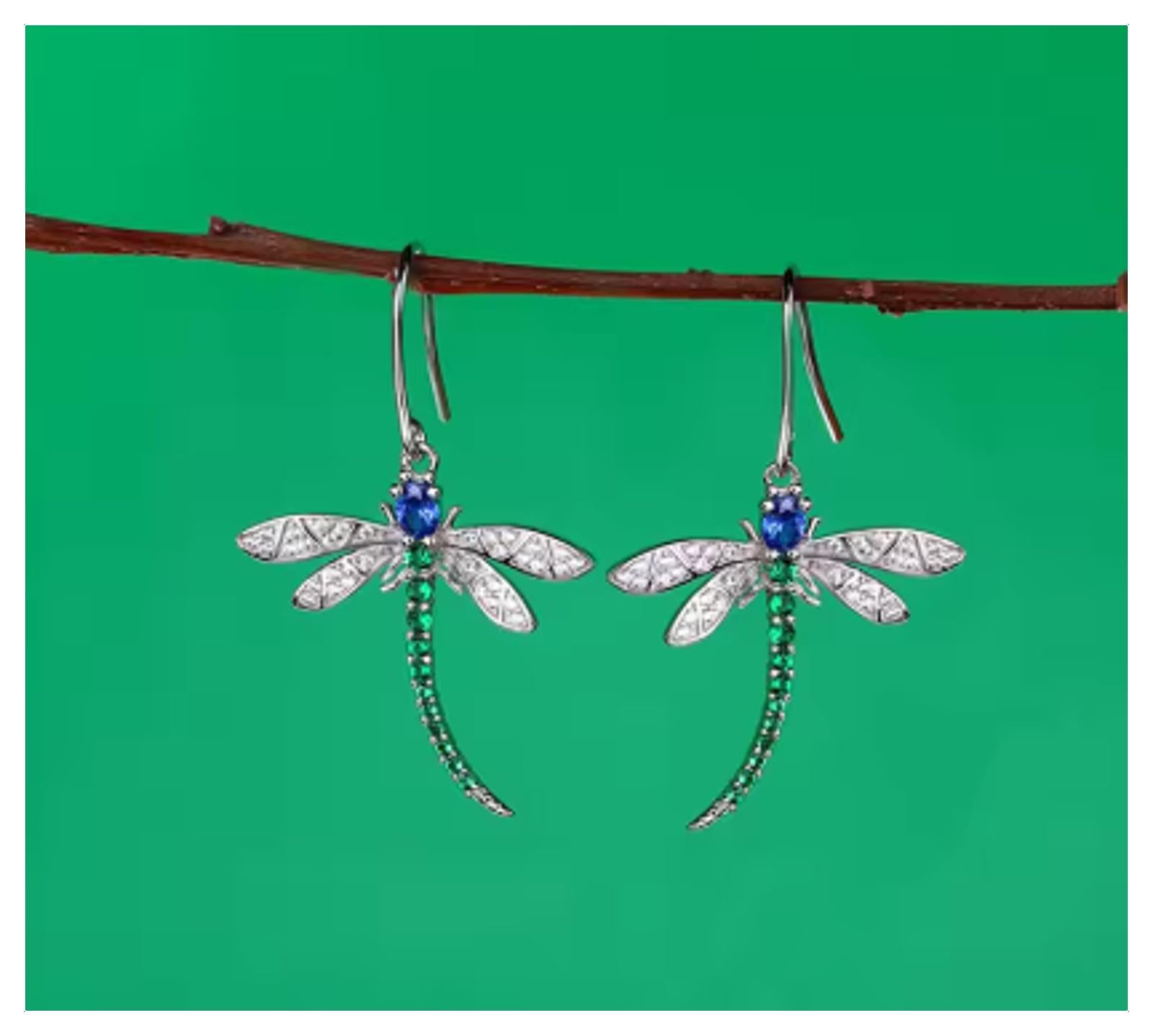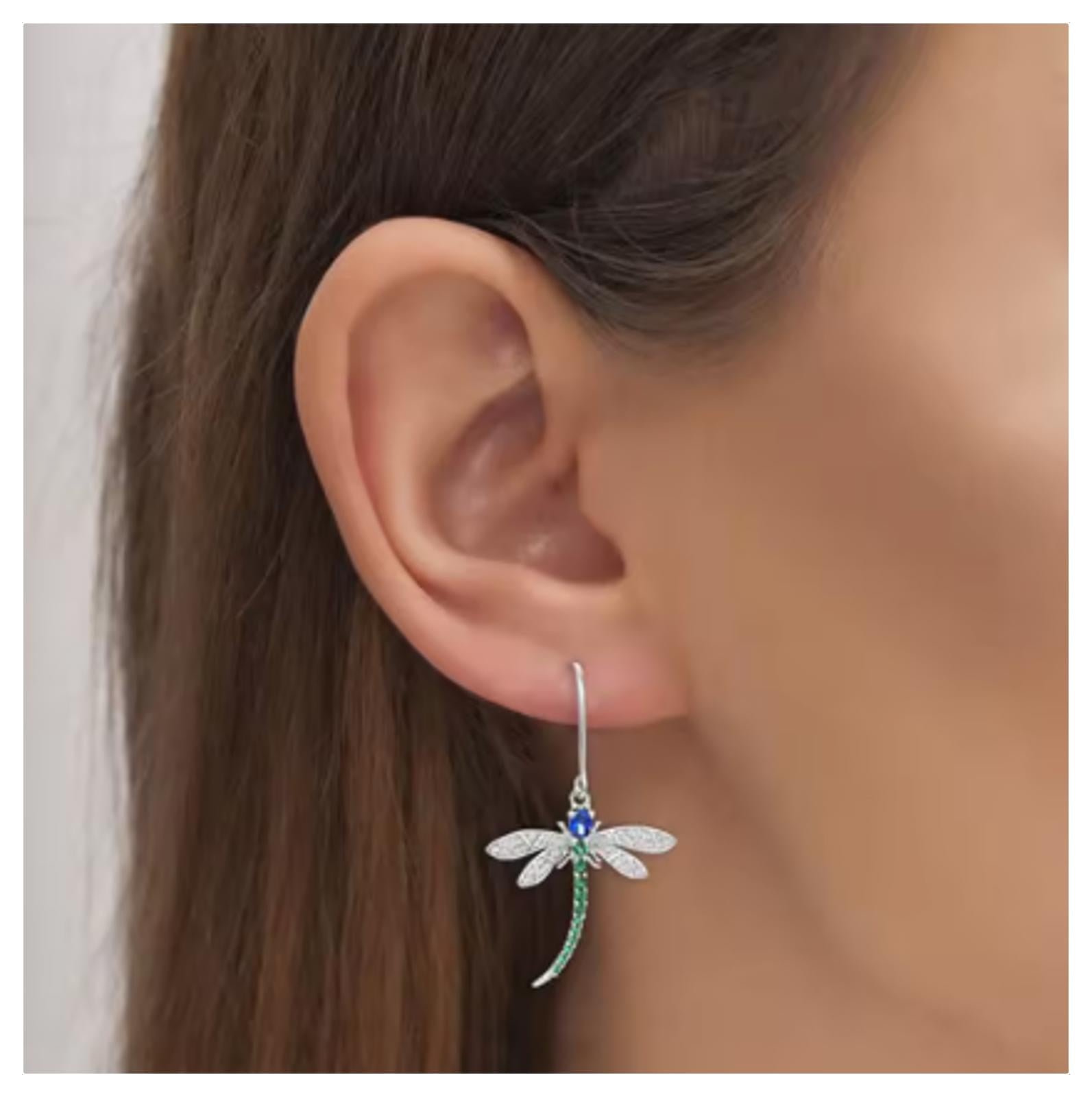 Green and blue dragonfly - Earrings - Silver - CZs - 18"