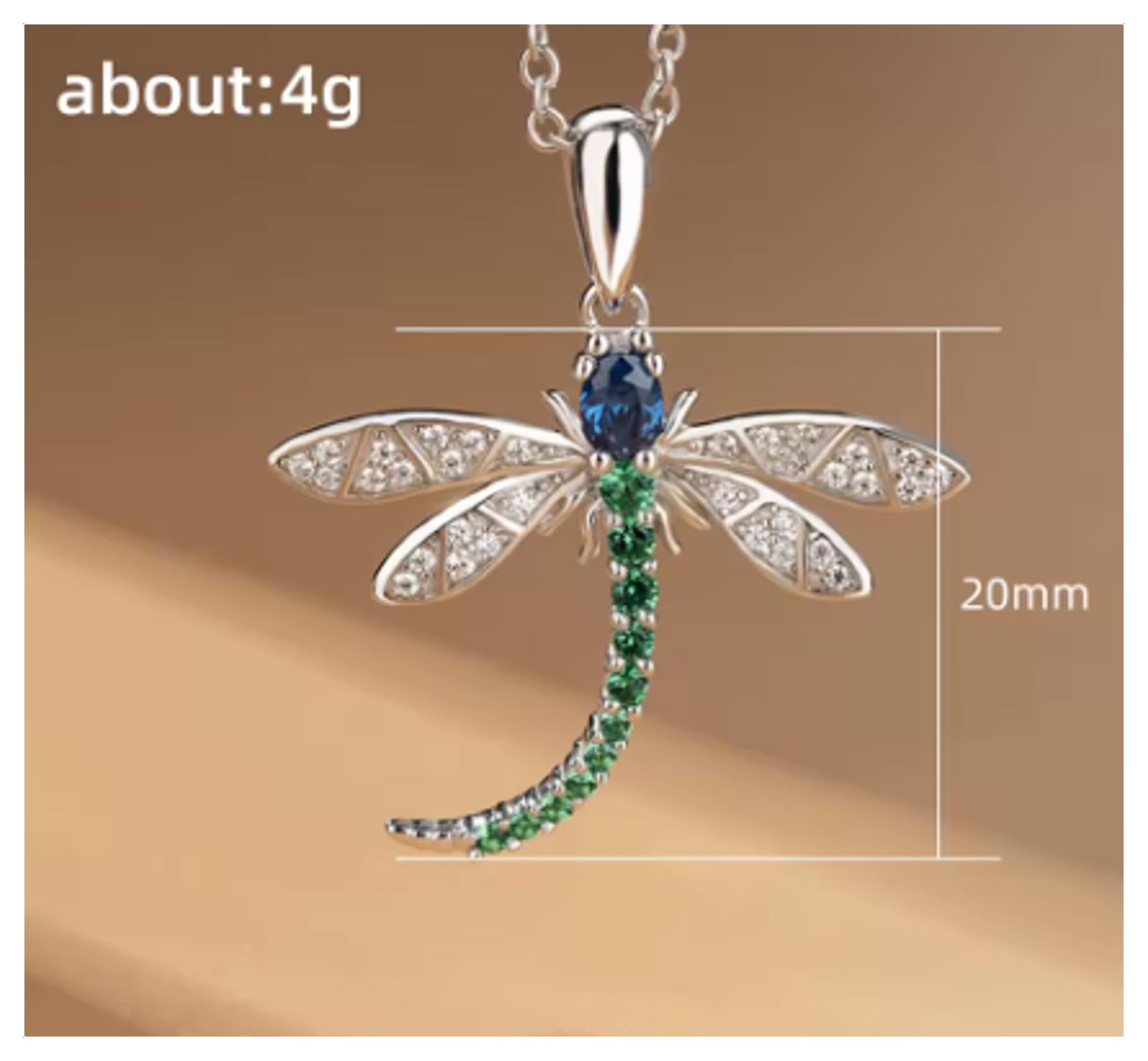 Green and Blue dragonfly pendant - Necklace - Silver - CZs - 18"
