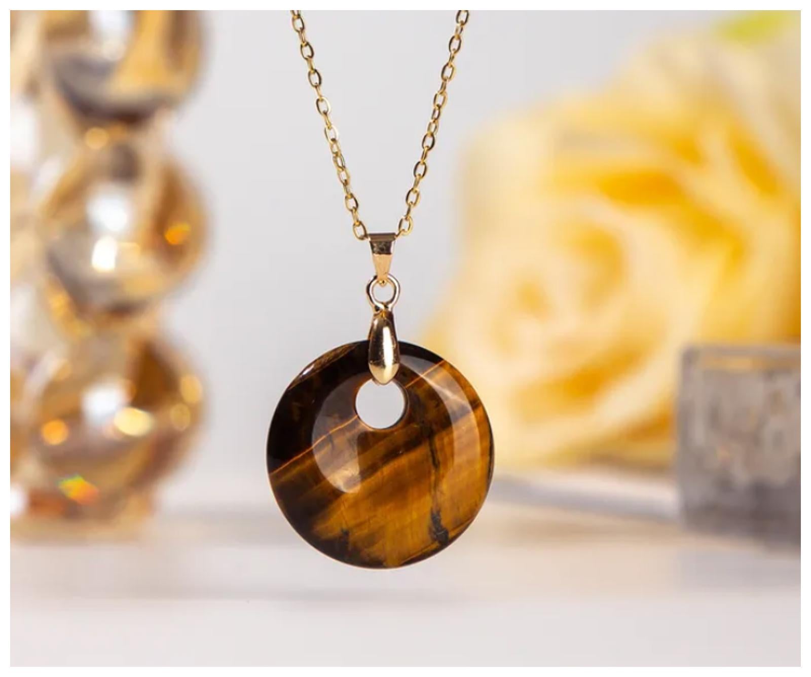 Natural tiger's eye round pendant - Necklace - Gold - 18"