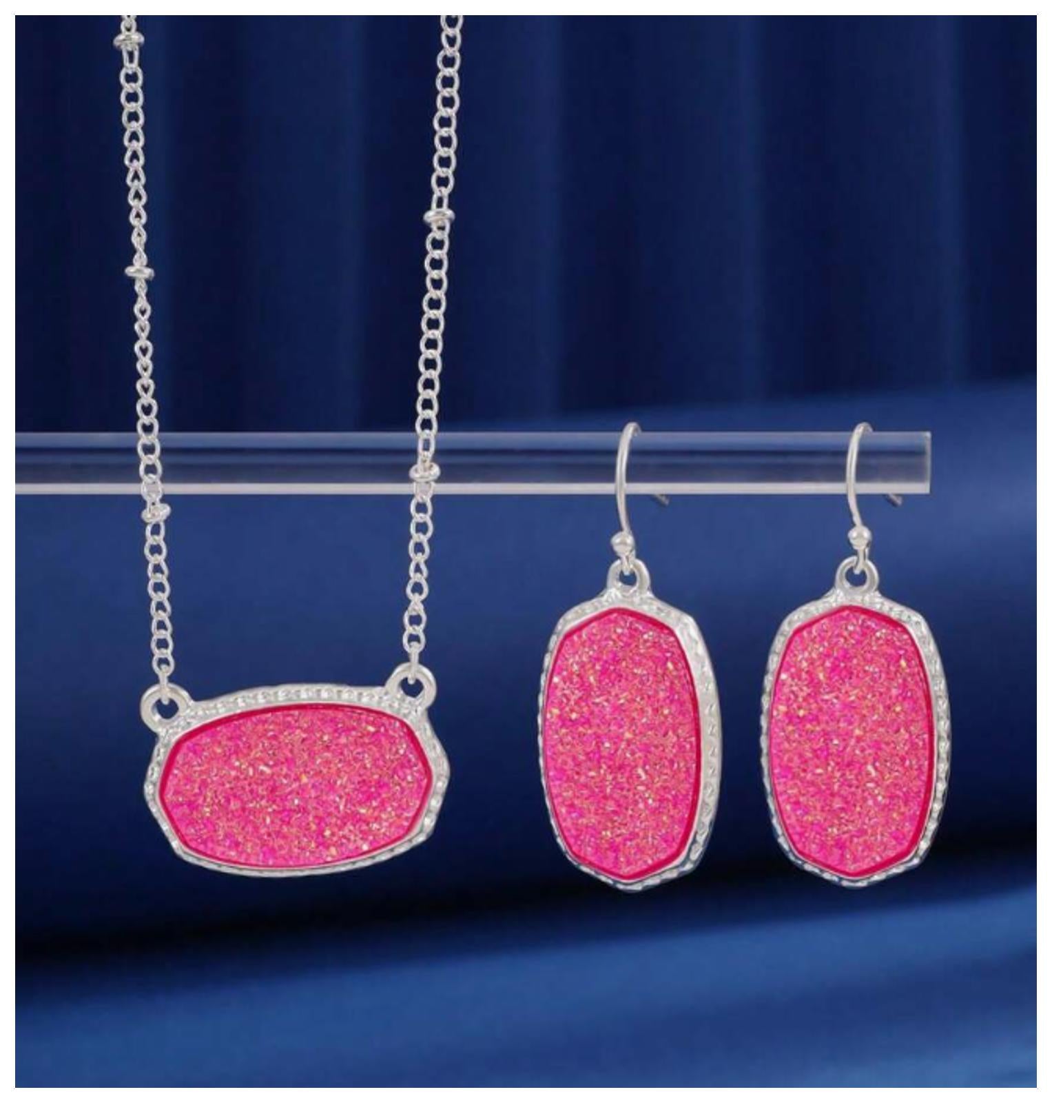 Pink glitter stone - Necklace/Earring set - Silver - CZs - 19"