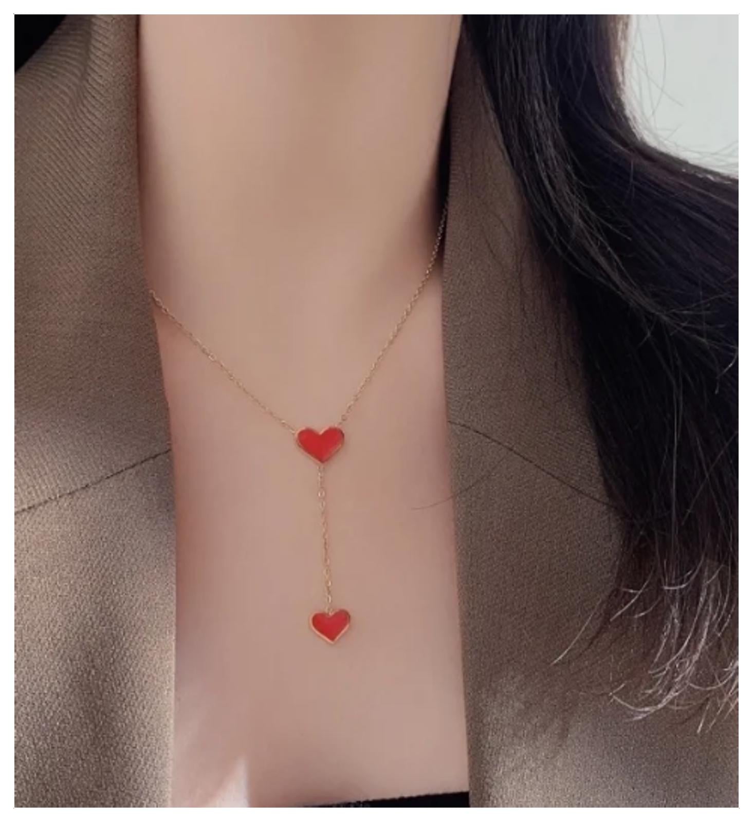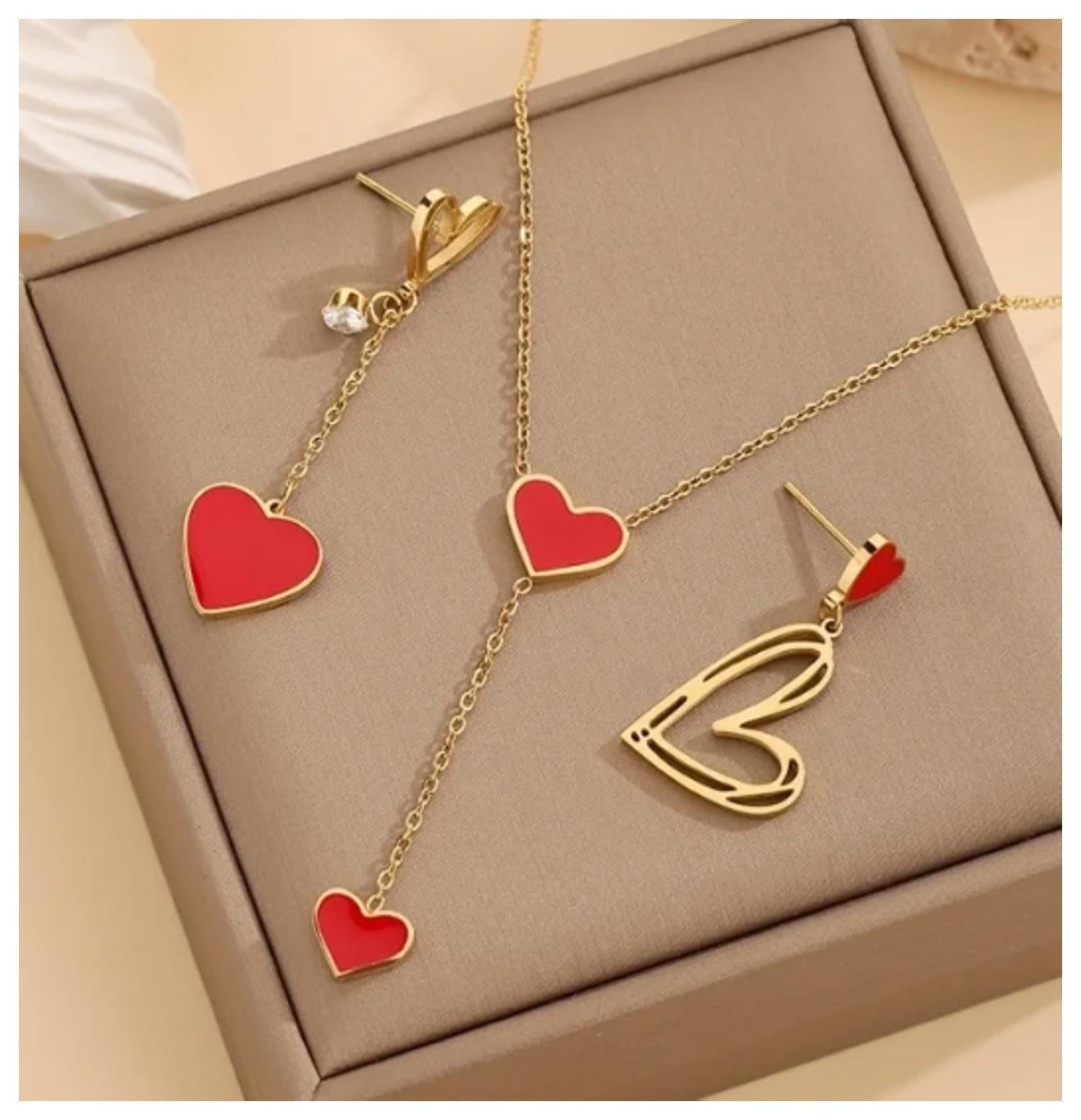 Red hearts Y-shaped - Necklace/Earring set - Gold - CZs - 18"