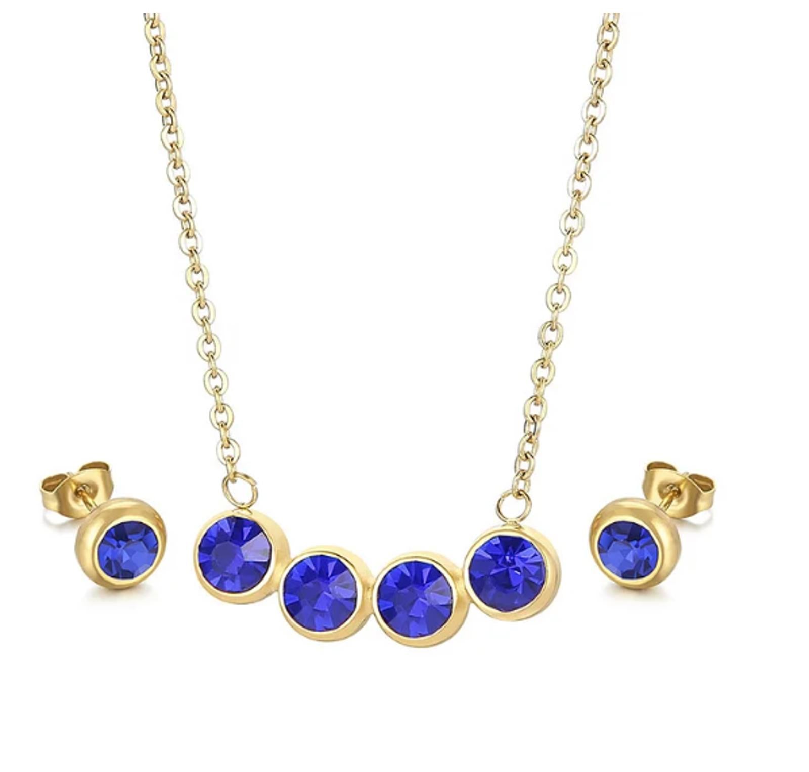 Round bezel set blue - Necklace/Earring set - Gold - CZs - 18"